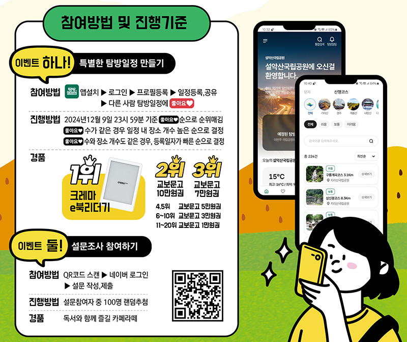 탐방일정 작성이 익숙하지 않다면 국립공원공단 직원들이 추천하는 양질의 일정표를 참고할 수 있어 더욱 편리합니다. 또한, 12월 9일까지 진행되는 출시 기념 행사에서는 탐방 일정을 작성하고 ‘좋아요’를 받으면 다양한 경품 추첨 기회도 제공되니 이번 기회를 놓치지 마세요!