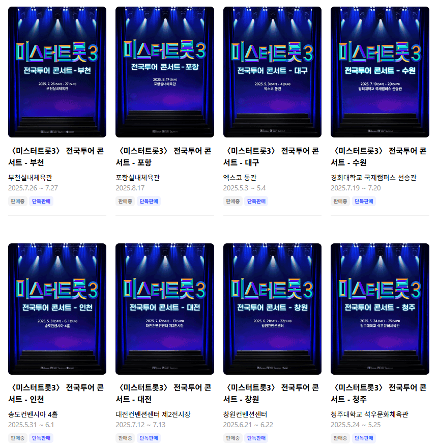 미스터트롯3 전국투어 콘서트 일정을 한눈에! 서울, 부산, 대구부터 광주, 대전까지 총 12개 도시 일정과 예매 정보, 티켓 가격, 출연진까지 완벽 정리. 트로트 팬이라면 놓치지 마세요!