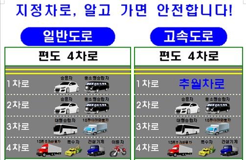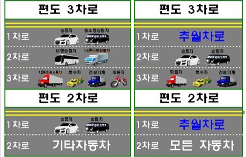 | 편도 2차로 | 1차로(추월차로), 2차로(모든 차량) |