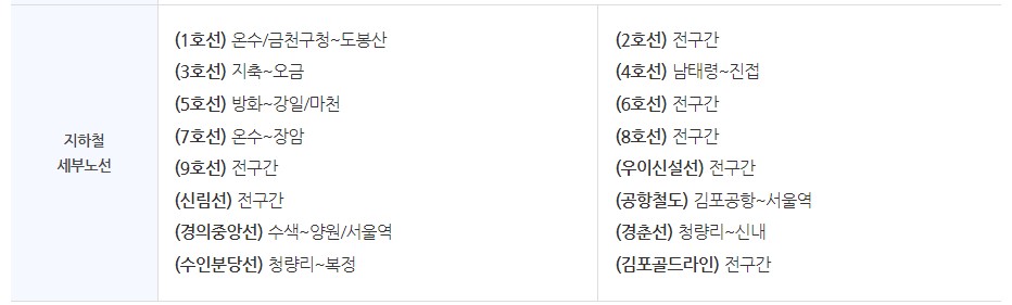 | 지하철 | 서울 지역 지하철 및 일부 구간 포함 (세부 노선은 표 참고) |