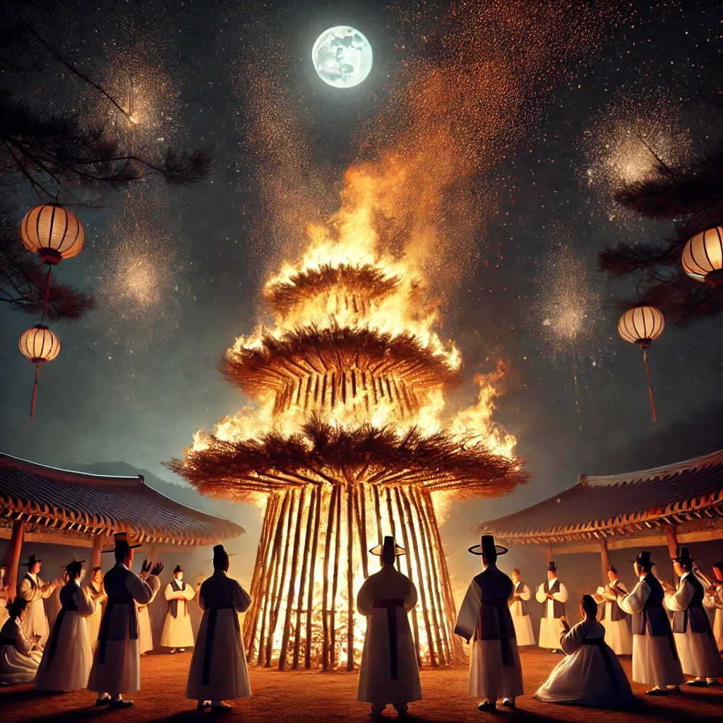 - 소나무 가지로 만든 달집에 불을 붙이며 액운을 태우고 복을 비는 의식입니다.
