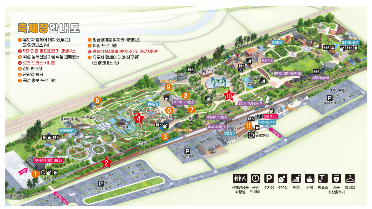 - 추천 코스: 장미 정원 → 기차 체험 → 푸드트럭 → 공연 관람 순으로 즐기세요.