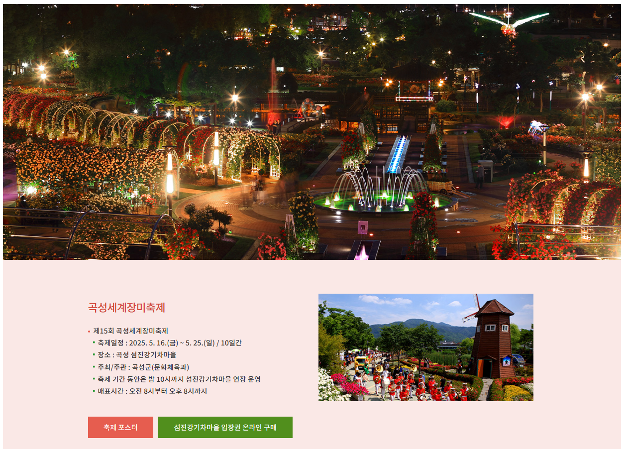 | 주요 키워드 | 곡성세계장미축제, 섬진강 기차마을, 장미축제, 곡성 여행, 봄 축제, 전남 축제 |