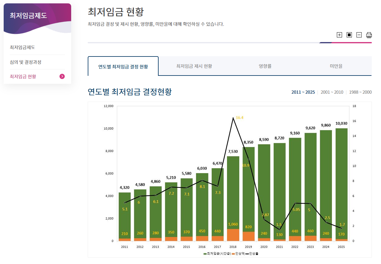 | 적용 연도 | 최저임금(시급) | 인상률(%) |